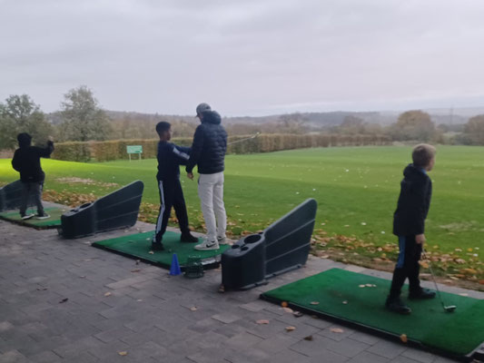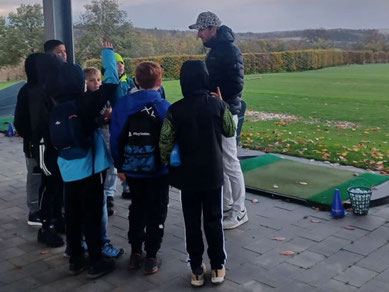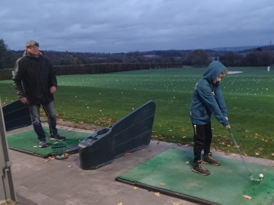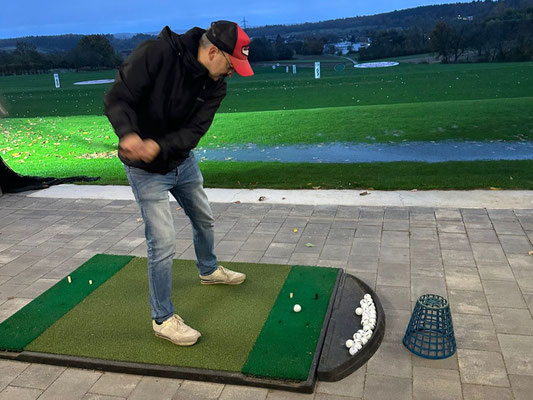 Anschließend ging es auf die überdachte Driving Range, wo uns Adrian einen sauberen Abschlag zeigte – und dann durften wir selbst ran! Von den ersten Versuchen, den Ball überhaupt zu treffen, über Schläge von ein paar Metern bis hin zu beeindruckenden Weiten von über 100 Metern war alles dabei.